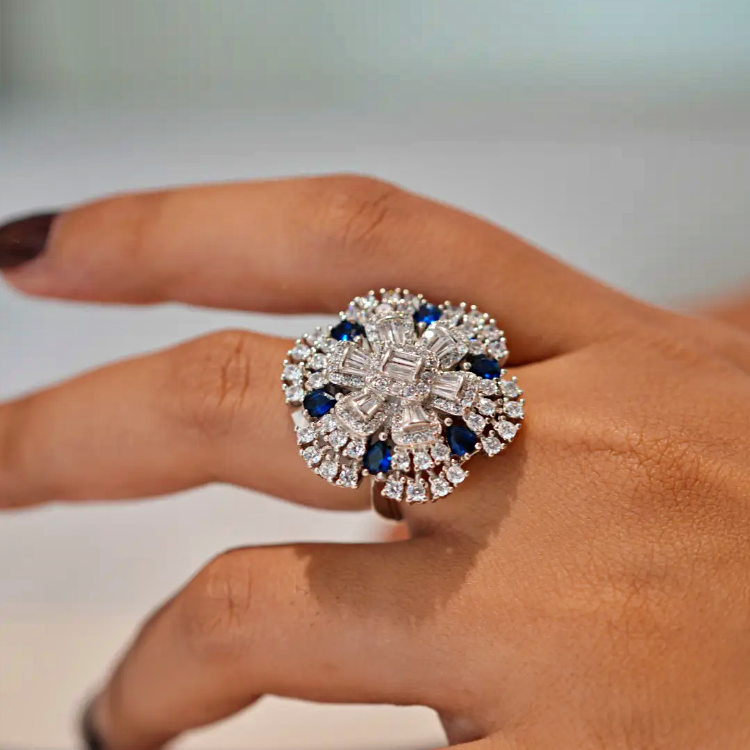 Silver Royal Blue Cutstone AD Modern Floral Ring