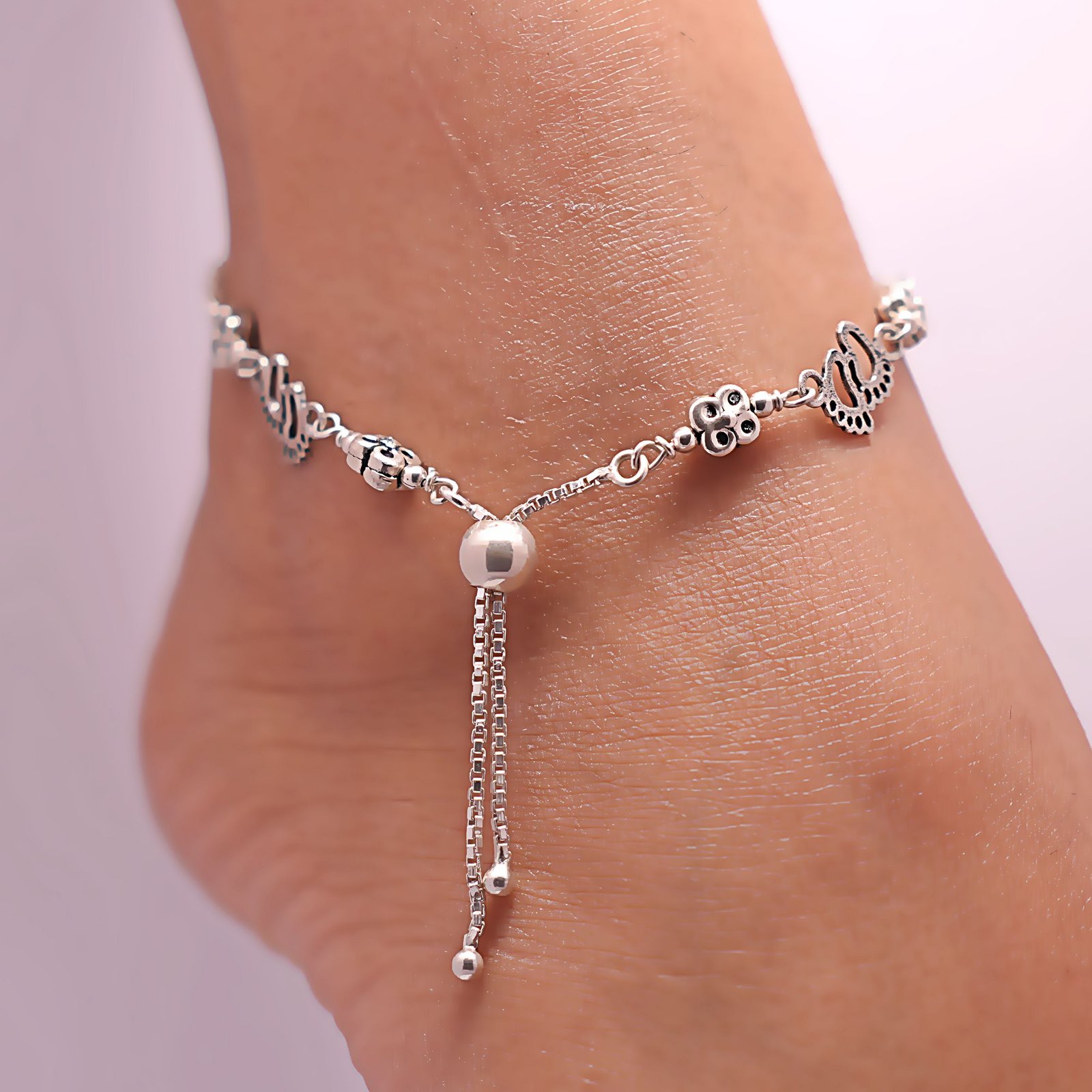 Sterling Silver Charm Flower Shape Ball Chain Italian Anklet