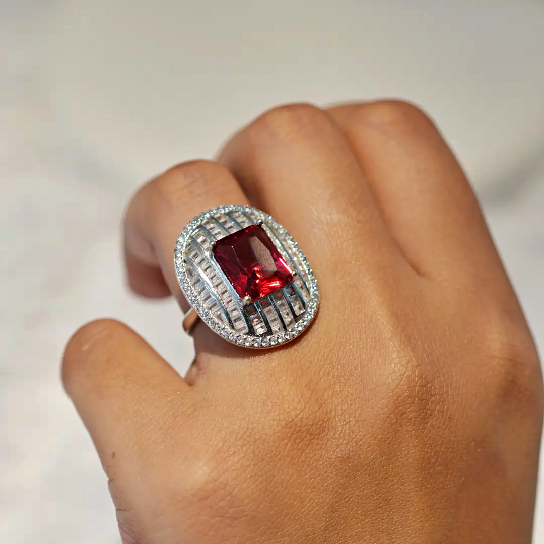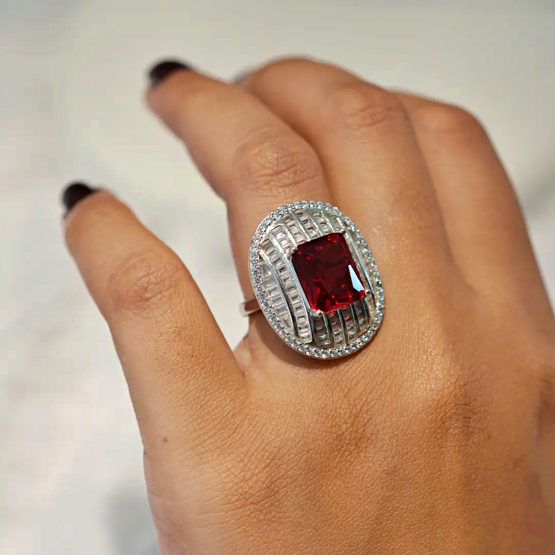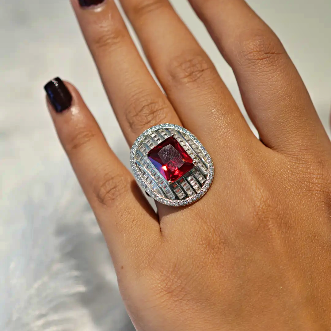 Sterling Silver Royal Red Cutstone Modern AD Ring